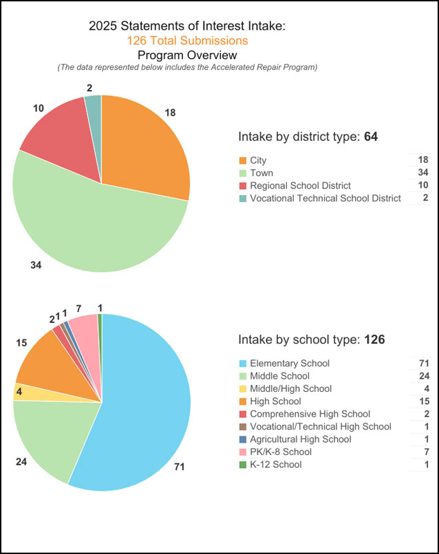 During the 2025 submission process, the Massachusetts School Building Authority (the “MSBA”) received a total of 126 SOIs submitted by 64 districts: 99 submitted by 47 districts for consideration in the ARP and 27 SOIs submitted by 21 districts, for consideration in the Core Program. The charts shown on this page provide an overview of the SOI submissions for the ARP and the Core Program by both school and district type.