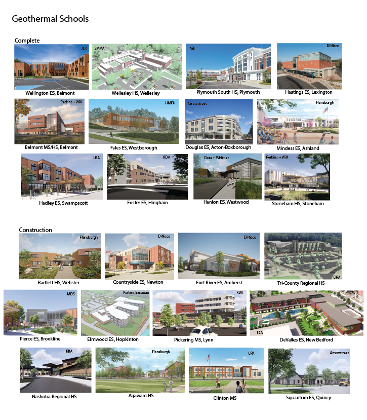 These MSBA projects include a geothermal ground source heat pump system. Virtually all MSBA new construction projects either include photovoltaic systems in the project, are designed to have photovoltaics purchased later by the district, or photovoltaics are installed through a Power-Purchase Agreement by the district after construction. Many projects that include geothermal wells also include photovoltaic panels.